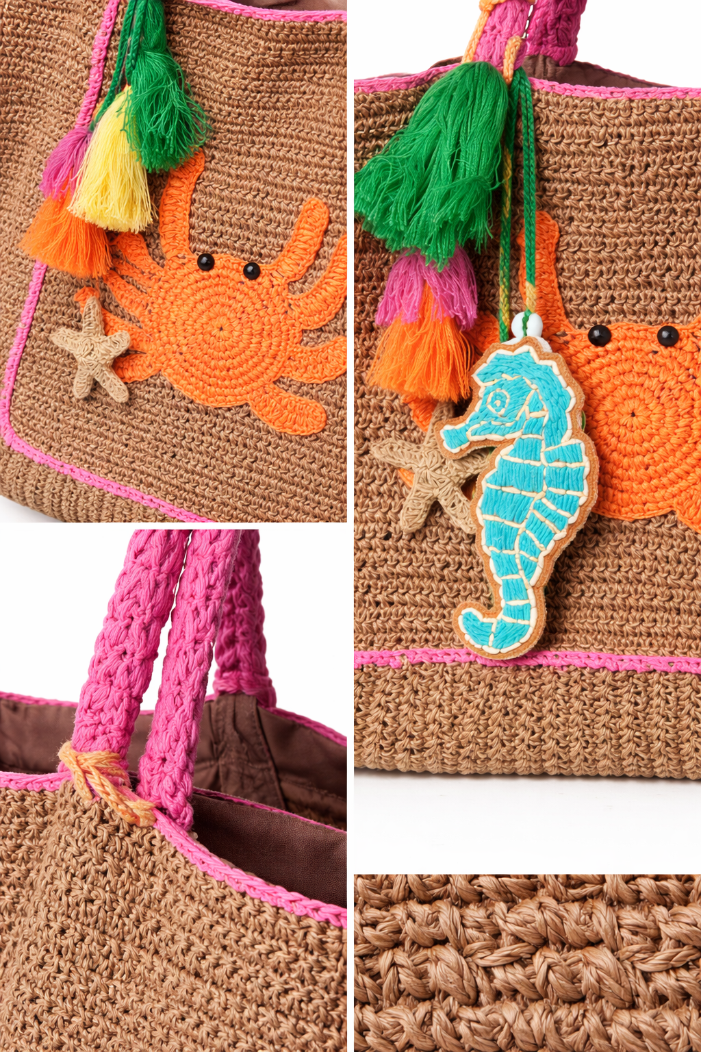 BOLSA CROCHET TEJIDA CON POMPONES DE COLORES Y ESTAMPADO MARINO
