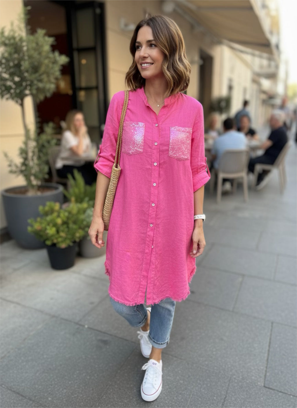 vestdio lino 3/4 con lentejuela en bolsas y trasero en la espalda